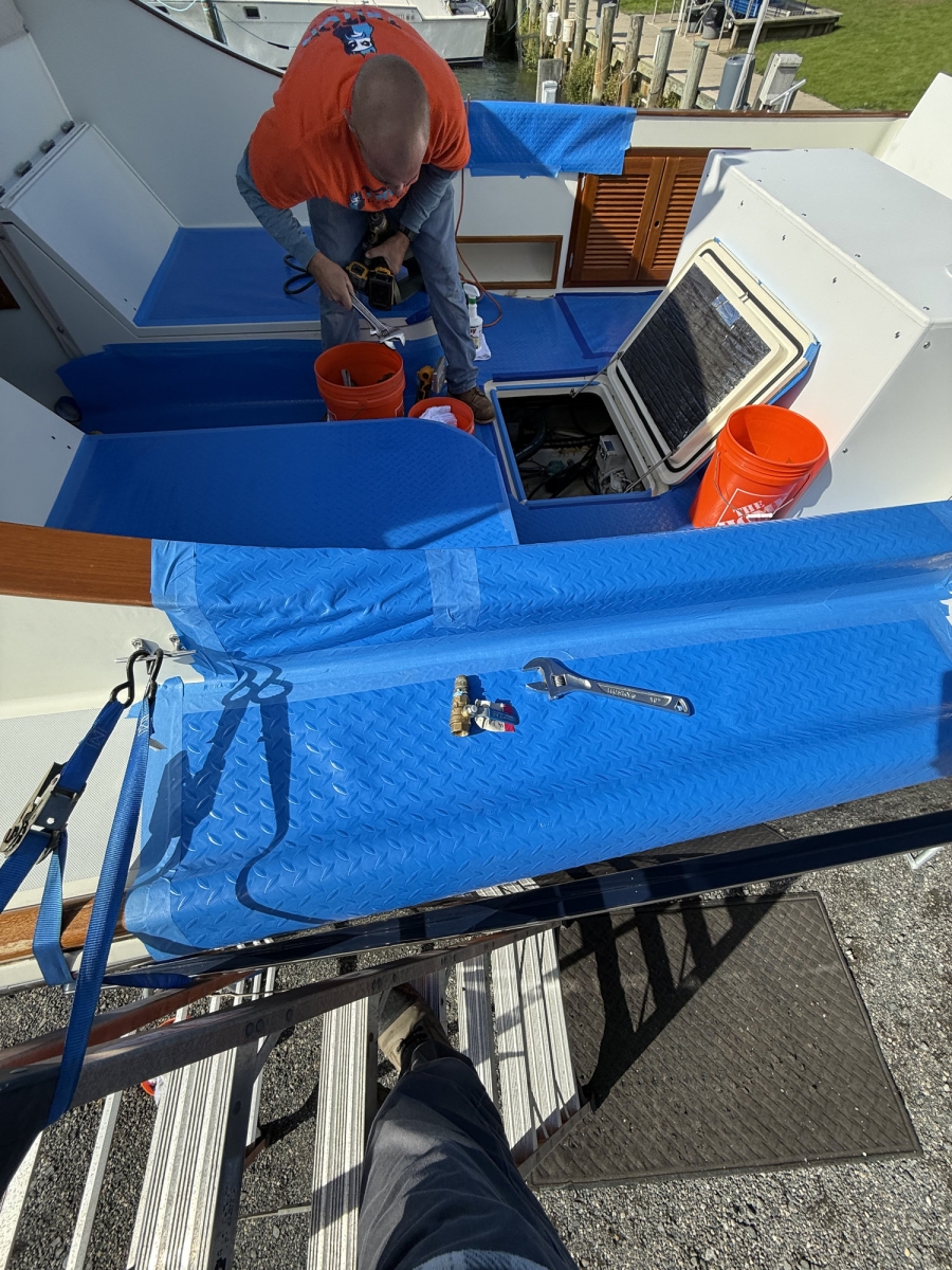 Triton Liners recently completed a two week rebuild of one (1) 290-gallon center fuel tank on a 2002 38′ San Juan at Kentmorr Marina in Stevensville, Maryland. A key part of this project was completing the work without removing the tank, cutting fiberglass or wood, or pulling engines. That approach helps minimize disruption to the vessel while still allowing the tank to be properly restored.