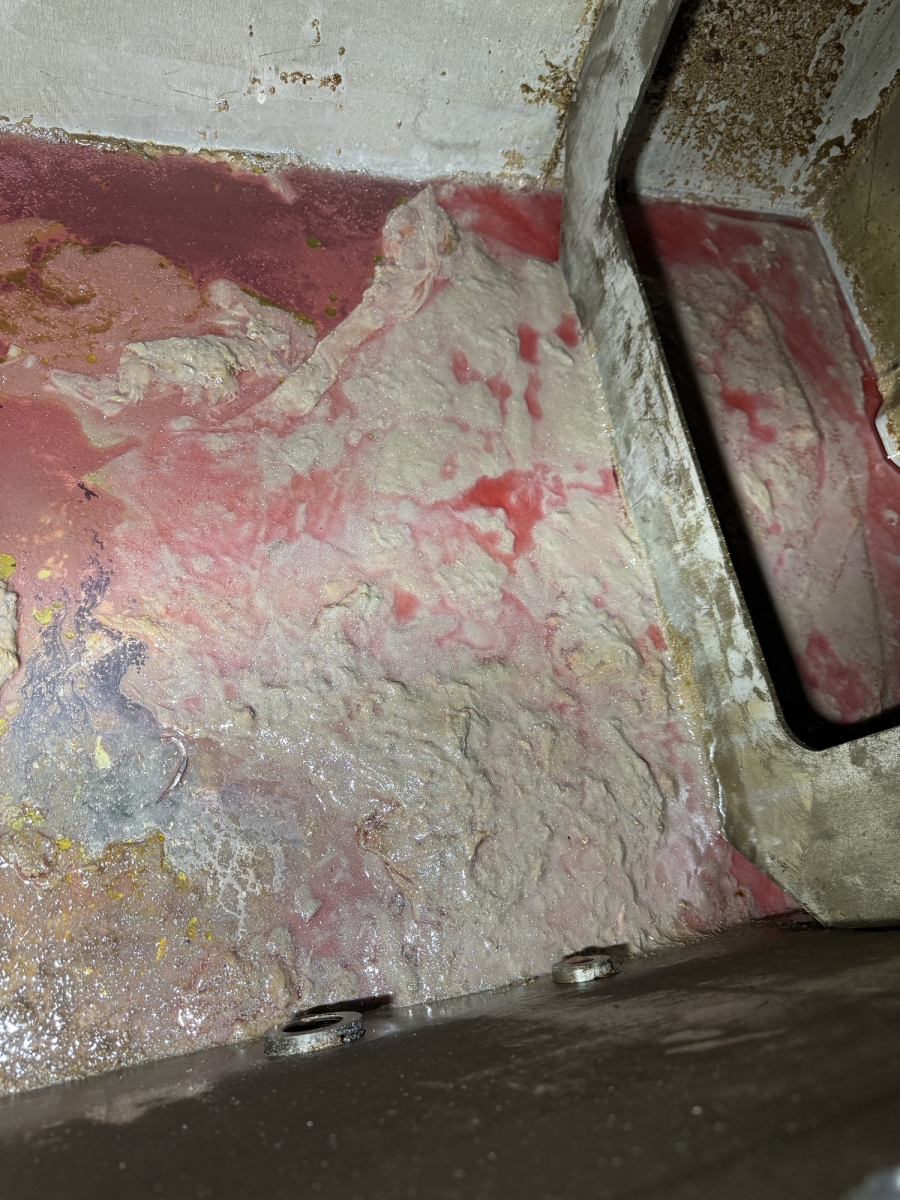 Triton Liners recently completed a three week fuel tank rebuild on a 2013 64′ Azimut at Bridgeport Boat Works in Bridgeport, Connecticut. The project involved rebuilding two (2) 500-gallon aluminum saddle tanks after heavy sludge buildup concealed corrosive pitting beneath the surface. It is a good example of why fuel tanks need to be opened, cleaned, and properly evaluated rather than judged by appearances alone. Once these tanks were cleaned, the underlying damage became clear, allowing our team to rebuild them the right way and restore dependable service.